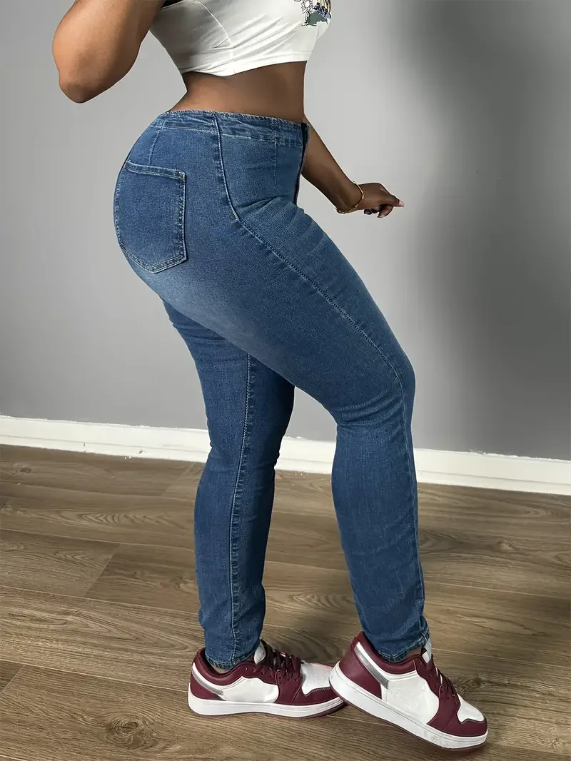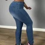 This is a pair of tight denim pants in dark blue with a neutral stretch fabric to show off your figure.